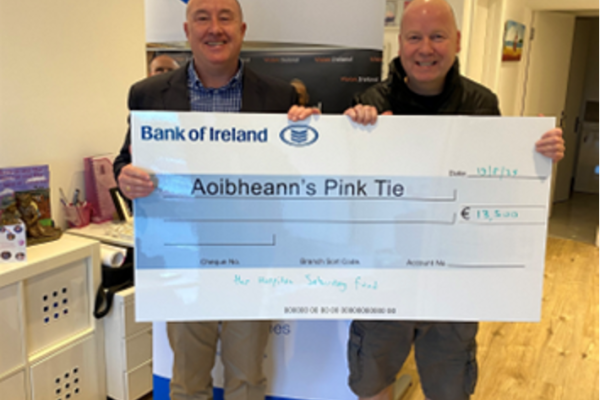 Paul Clare, Managing Director, HSF Health Plan, presenting a grant of €13,500 to Mick Nochford, CEO, Aoibheann’s Pink Tie to support the creation of Comfort Care... read more →